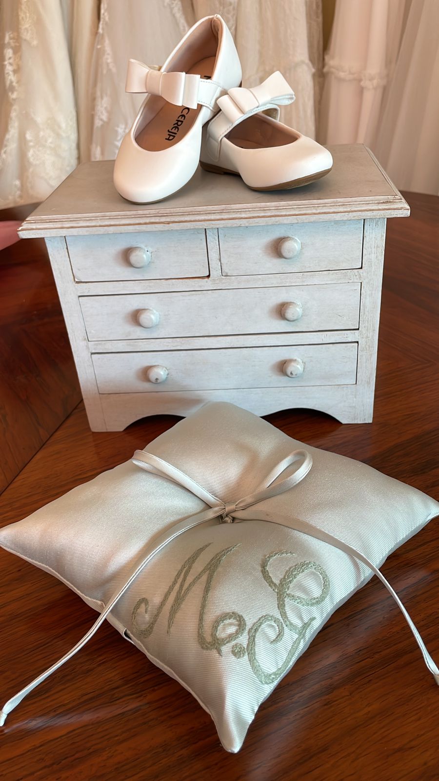 O material é cetim de alta qualidade, na cor off white, e o tamanho da almofada para aliança é ideal para mãos pequenas. Combina perfeitamente com vestidos de dama de honra.