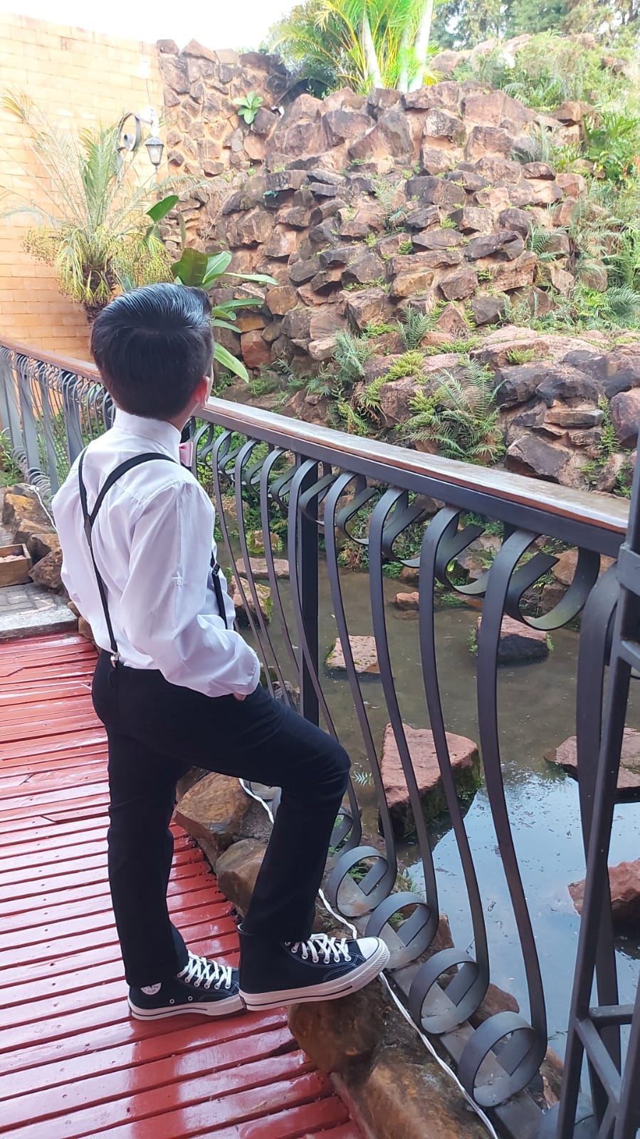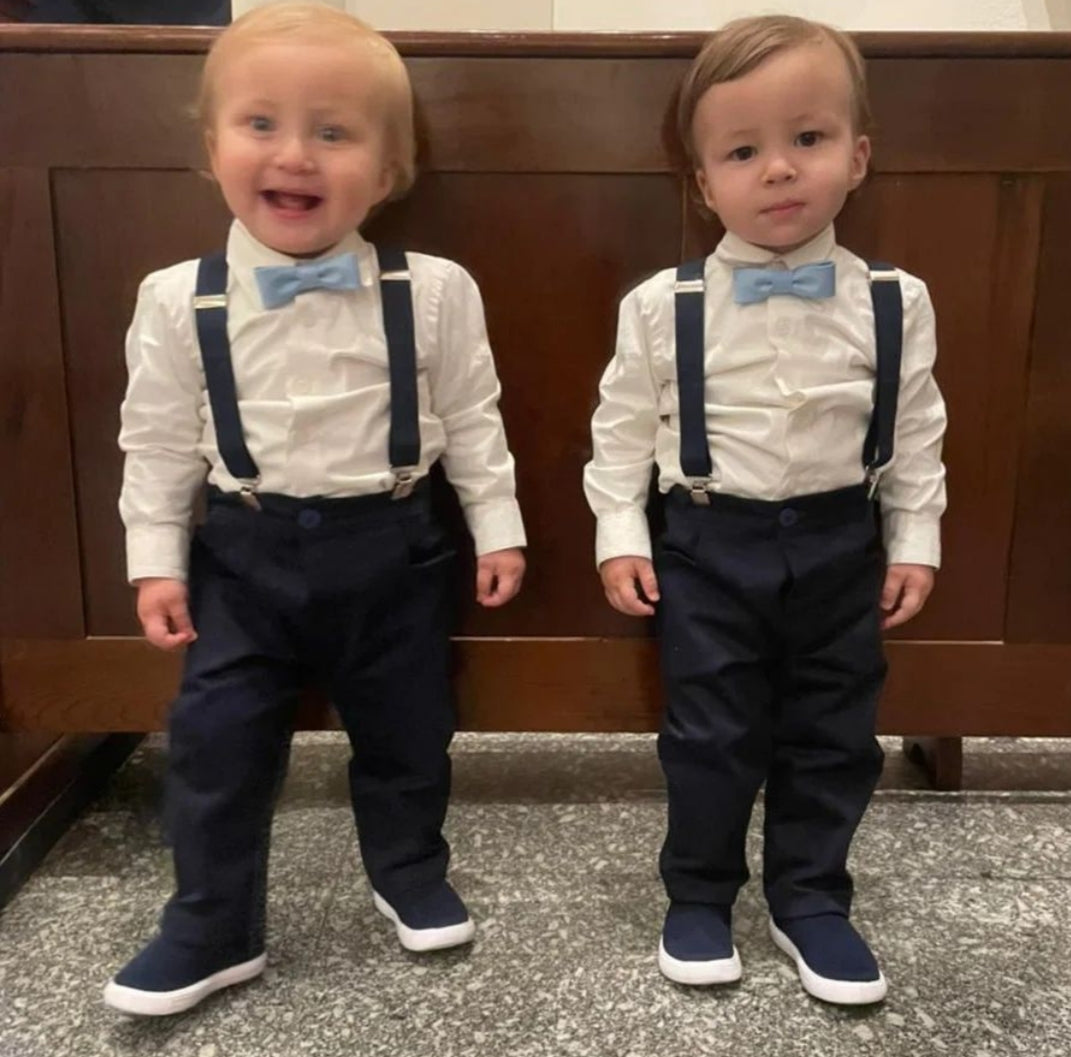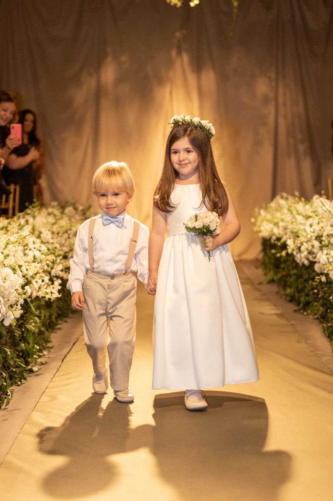 Conjunto com Calça e Suspensórios para Pajem, camisa branca e gravata borboleta no mesmo tecido do cinto da Dama de Honra.