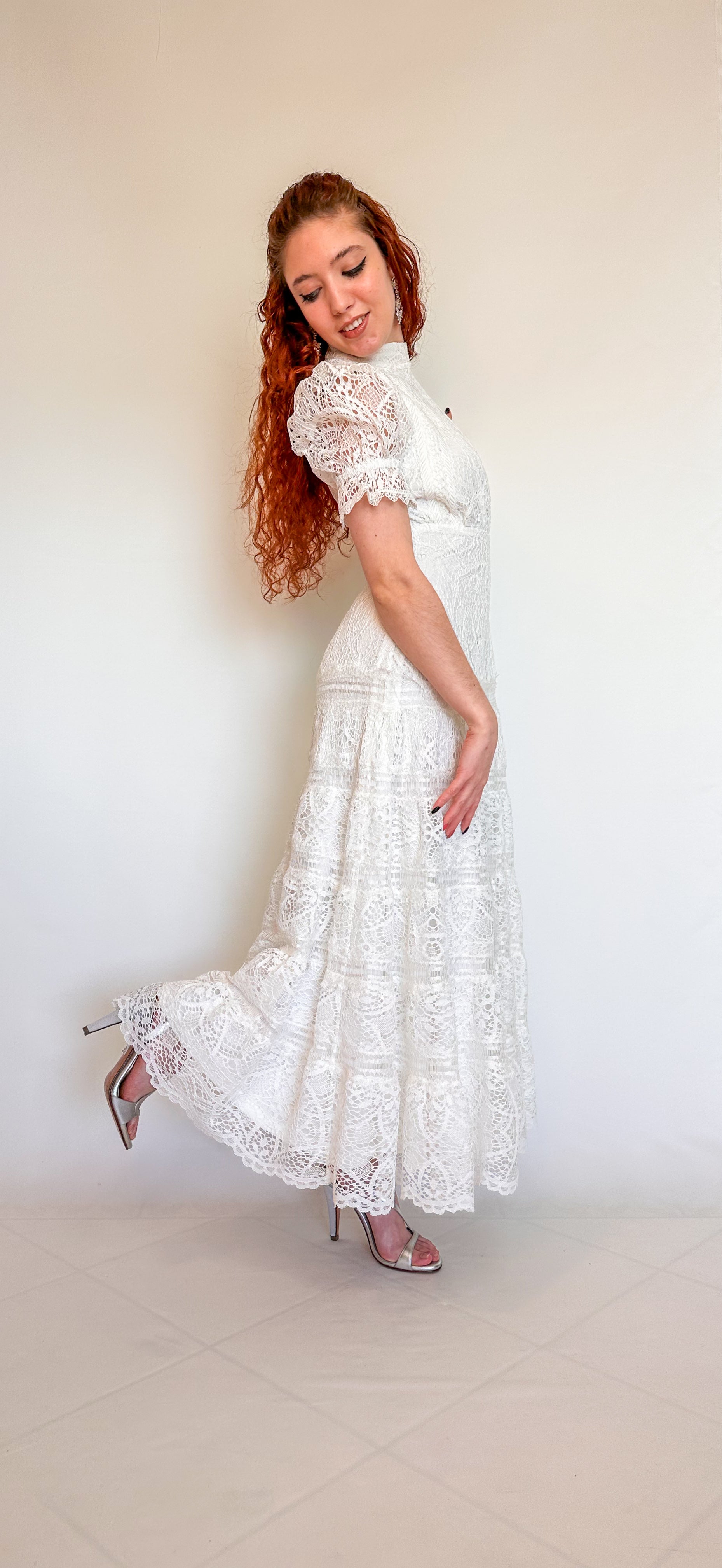 Vestido em renda off-white com mangas bufantes em transparência delicada, cintura demarcada e saia mídi fluida. O modelo combina romantismo e sofisticação, trazendo detalhes rendados que valorizam a silhueta e conferem leveza ao visual. Ideal para Bat Mitzvah, Primeira Comunhão, celebrações religiosas e eventos especiais que pedem um look clássico, elegante e atemporal.